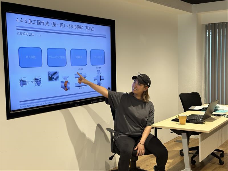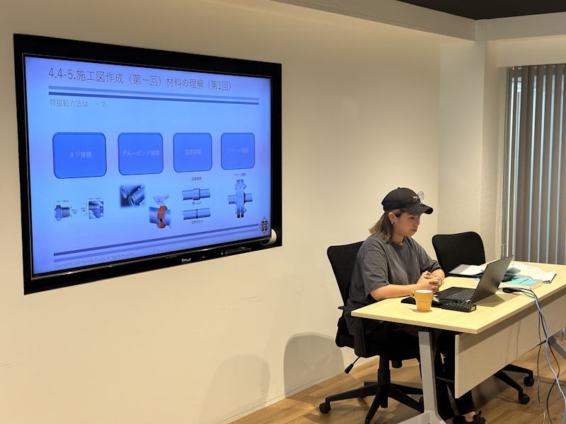 主に業務で扱う消防設備の概要や所轄消防署への提出書類作成、図面作成や現場実習等を中心に研修を進めています。